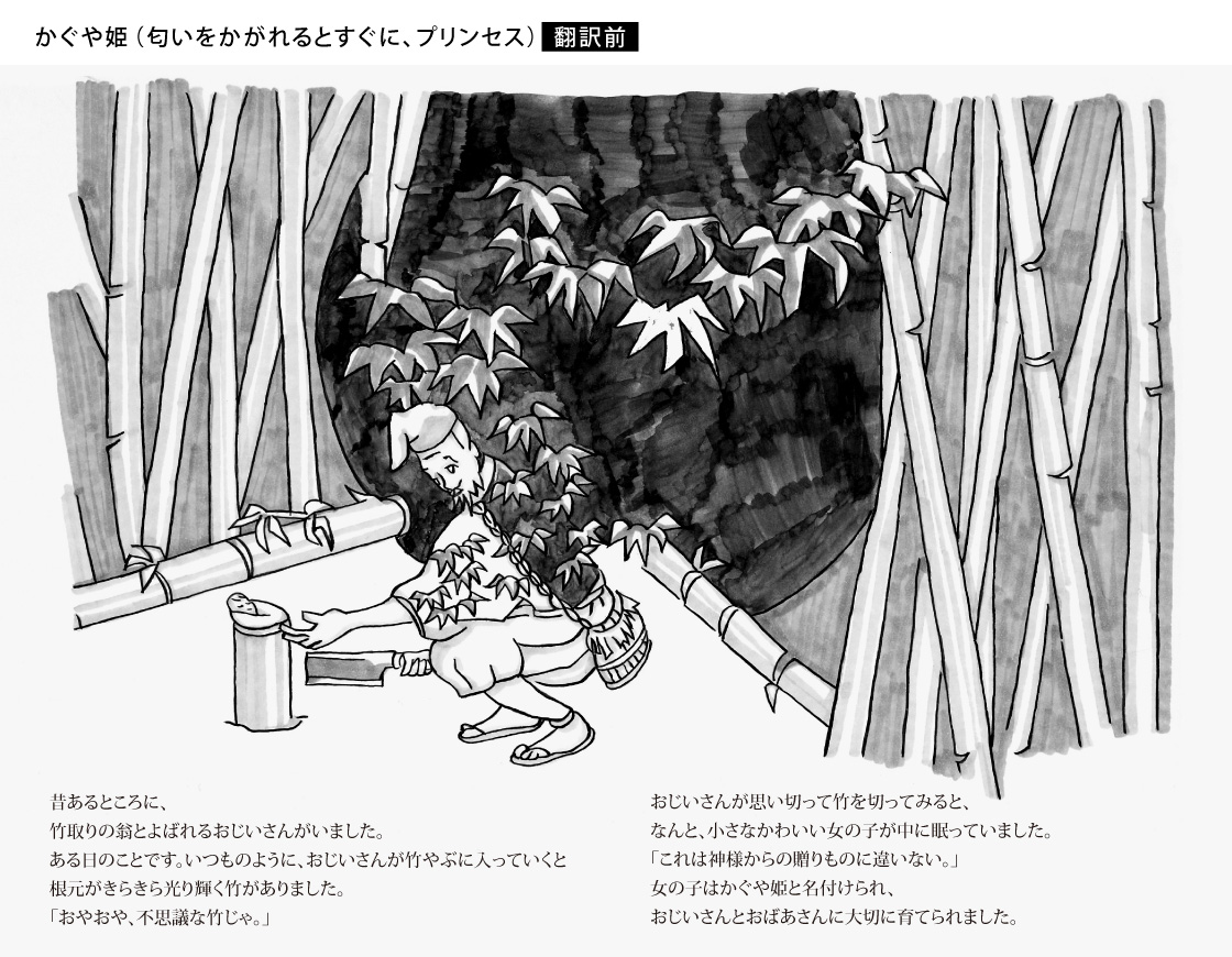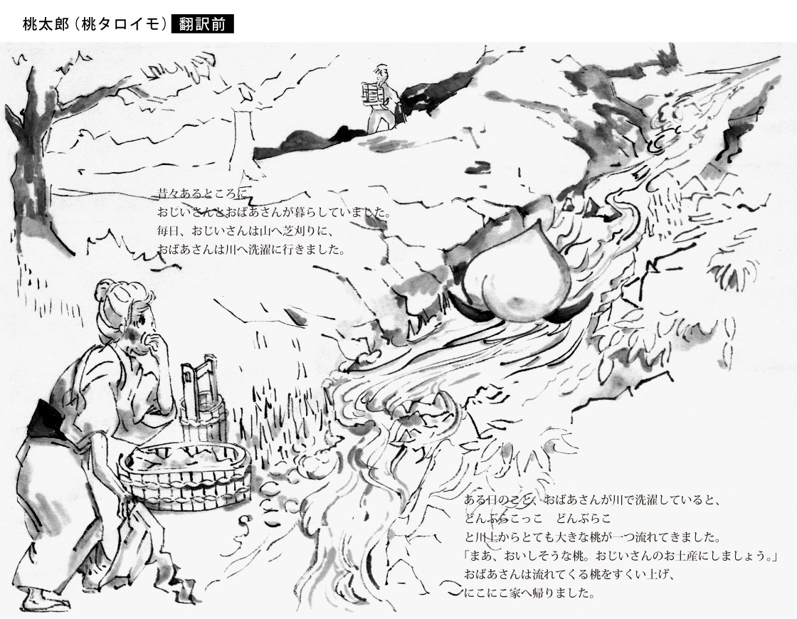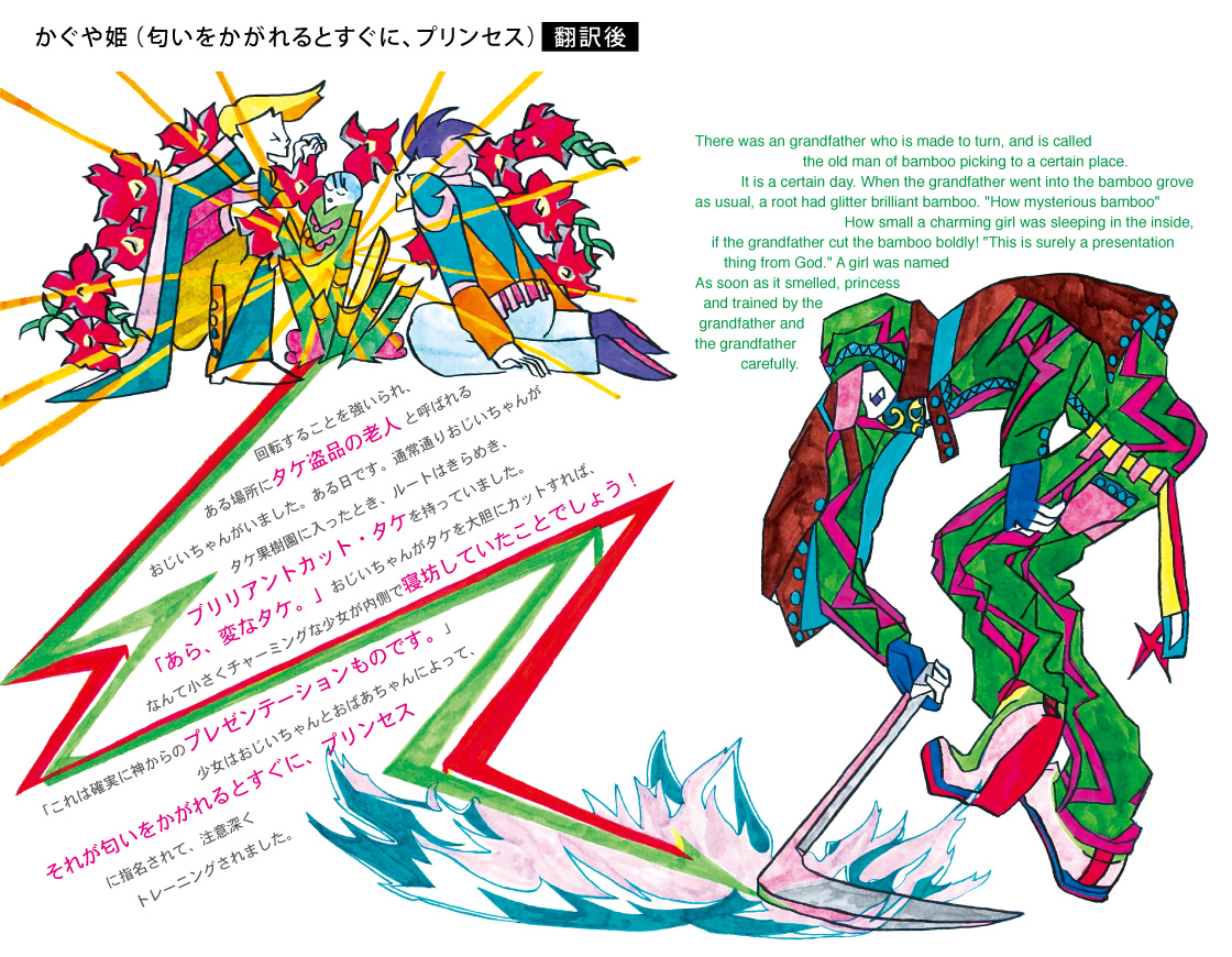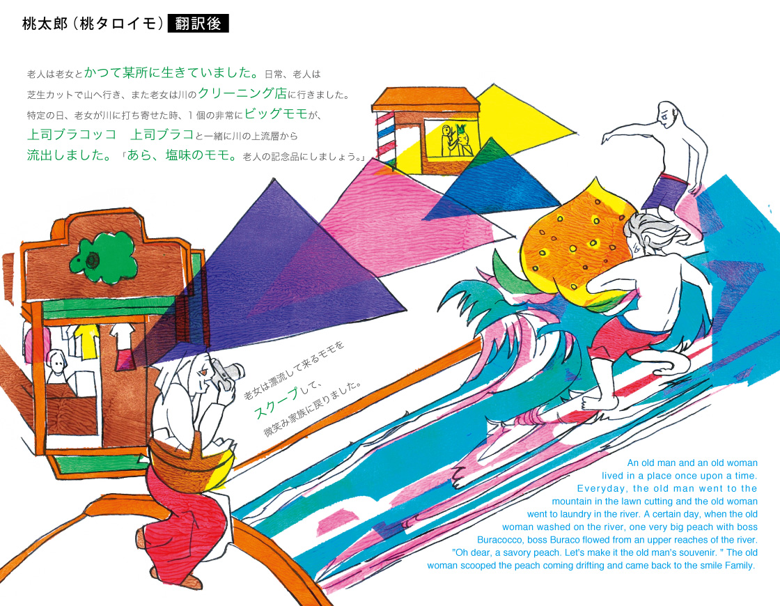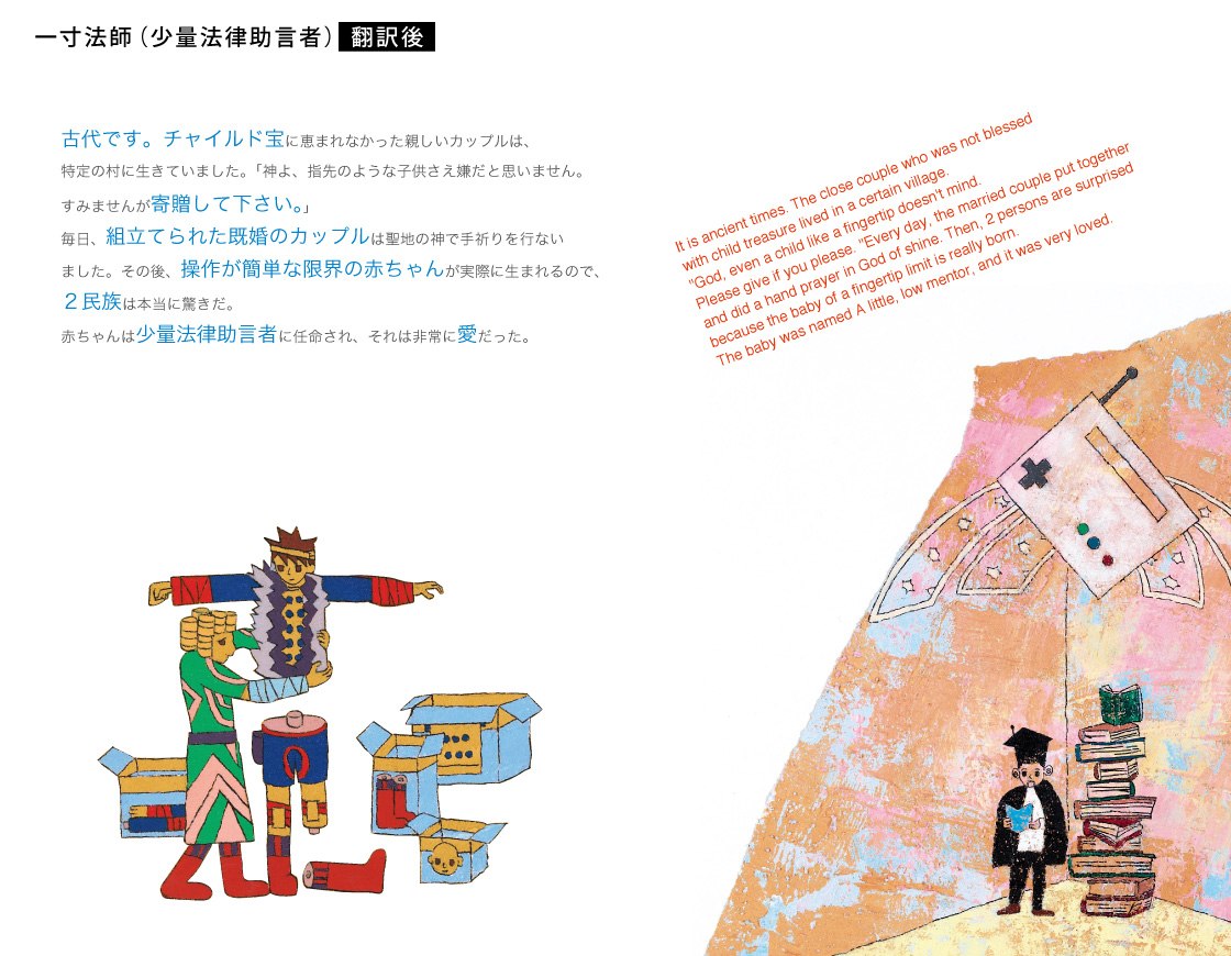 15種類に及ぶコンピュータの自動翻訳ソフトを駆使し、日本人なら誰もが知っている日本昔話3編「一寸法師」、「かぐや姫」、「桃太郎」を日本語から英語に自動翻訳し、さらに日本語に再翻訳。そして、コンピュータが生み出した文章からイメージしたイラストを添えた、まったく新しい現代の昔話の誕生。グローバル化が加速する現代において他言語間でのコミュニケーションをする機会が日々増えています。そして、それを補助する代表的なツールとして翻訳ソフトが存在しますが、現時点において翻訳ソフトの実用性はあまり高いとは言えません(単にコミュニケーションツールとしての)。なぜなら現在一般に出回っている翻訳ソフトでは、言葉の背景にある感情、文化や歴史、行間にある意味などを汲み取ることが非常に難しいからです。しかし、逆に考えれば翻訳ソフトは人間が到底思いつきもしない表現をすることができるとも言えるのではないでしょうか。この作品ではコンピュータによる無数の無機的な言葉の羅列を人間がミックスすることによって、人間と機械による新しい文学を創造します。