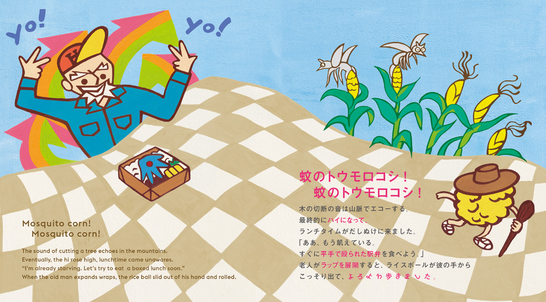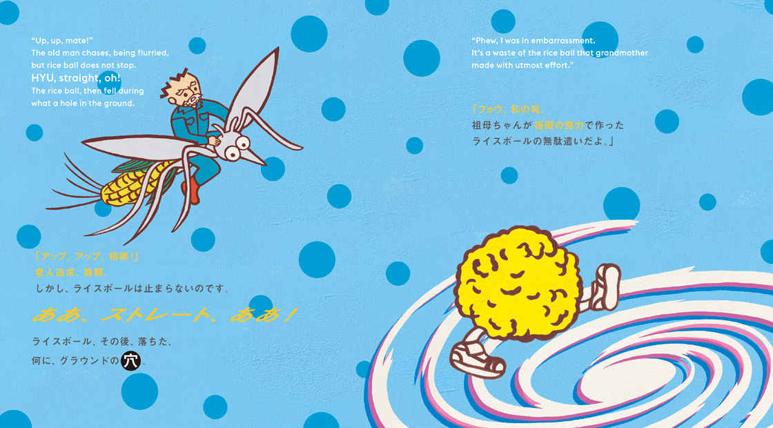 日本の代表的な昔ばなしである「おむすびころりん」を、インターネット上で公開されている10数種類の自動翻訳サイトで英語に翻訳し、更に日本語に再翻訳。そして、コンピュータが生み出した数多の文章表現をミックスし、そこからイメージされるイラストを添えて絵本に仕上げました。本書はまず、子どもの頃に親しんだ「おむすびころりん」の話が始まります。そして次に自動翻訳された話が続き、それらが交互に展開されます。原文の「おむすびころりん」と、誤訳・多義語・言い回しの違いから繰り広げられる自動翻訳後の物語を見比べながら、シュールな世界をお楽しみください。